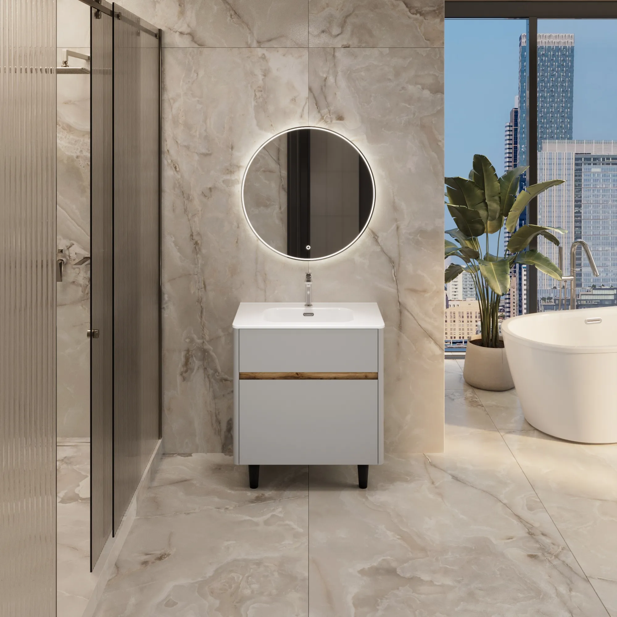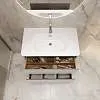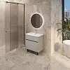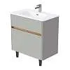 Матовый фасад, интегрированные ручки, керамическая раковина* с широкими бортами для хранения и полки в тон теплому дереву придают интерьеру изящность и подчеркивают уникальный характер. Трендовый серый цвет освежает интерьер, делая его современным и мягким, а тумбу подходящей для большинства интерьеров ванной комнаты.